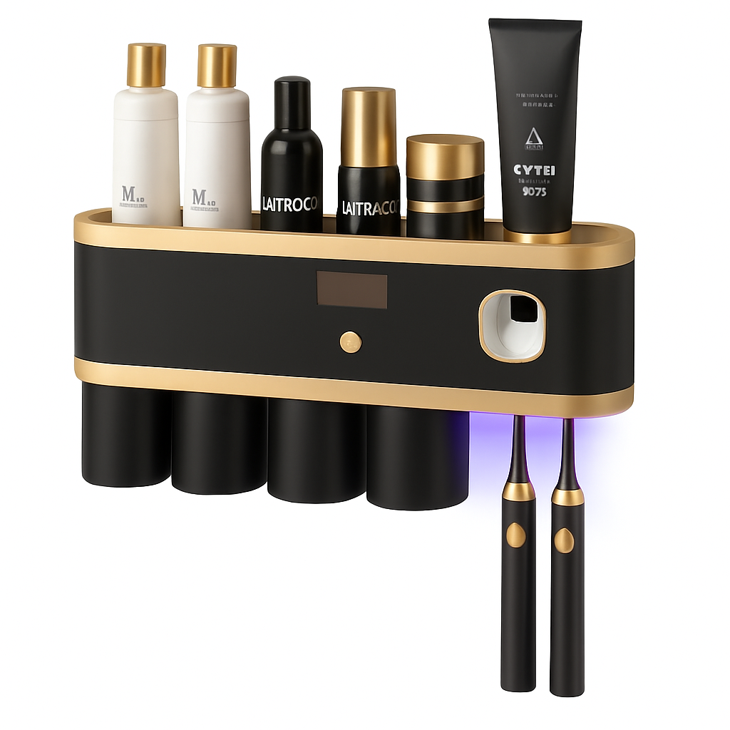The ultimate all-in-one UV station. Sterilizes your brushes, dispenses toothpaste, and organizes your bathroom essentials in one sleek, premium unit. Maximum storage, maximum hygiene, zero clutter.