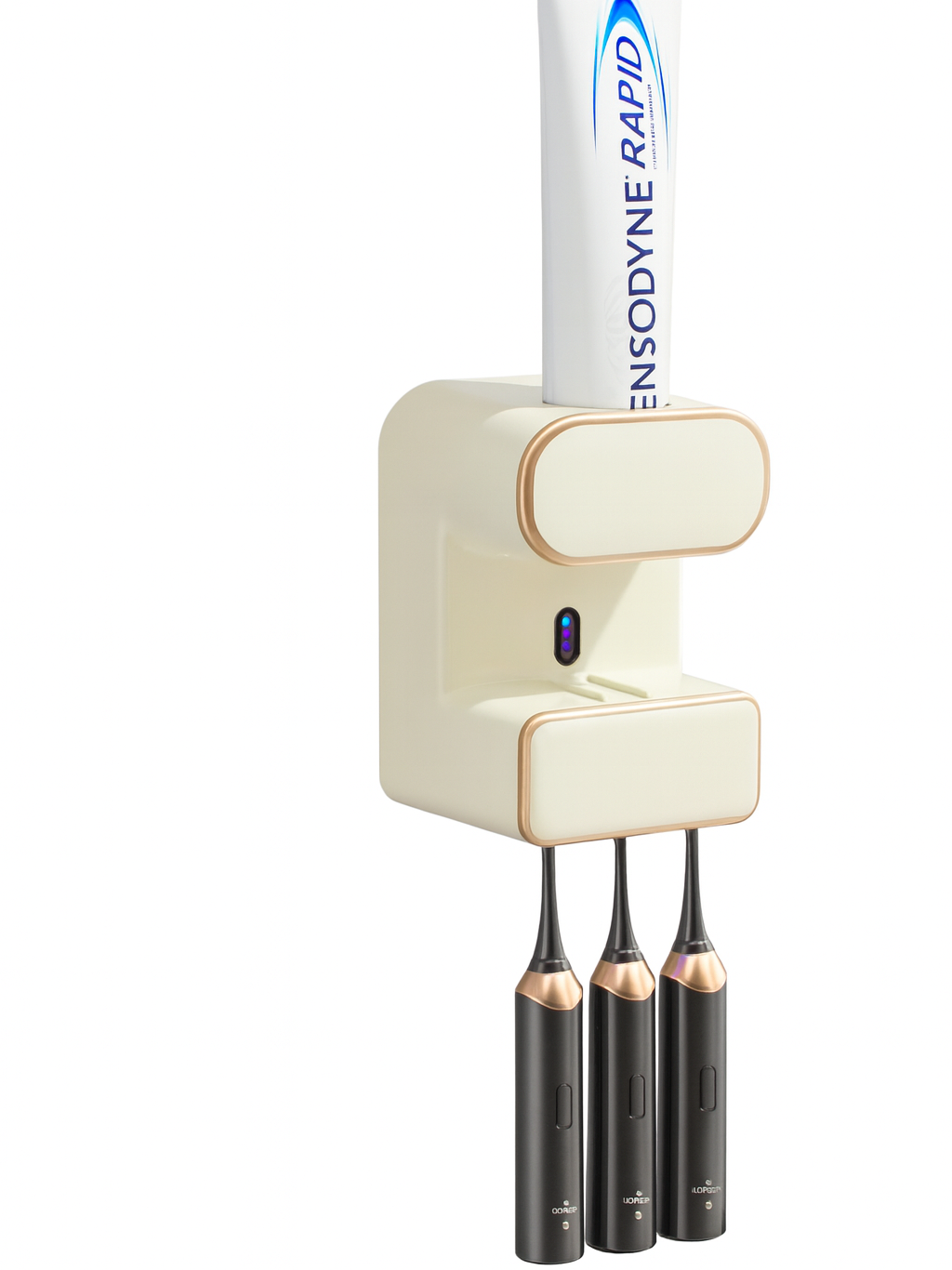 A full-size UV toothbrush station that sterilizes, stores, and organises your brushes in one sleek unit. Powerful UV-C cleaning, space-saving design, and everyday freshness—made effortless.